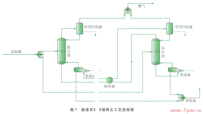 圖7為應用ProMax軟件模擬醇胺溶液雙效精餾再生工藝流程。將胺液再生過程分為高、低壓2個再生塔,高、低壓塔分別得到等量從吸收塔中出來的醇胺溶液,各塔處理量為原再生塔的一半。在高壓塔頂增加冷凝器,并在低壓塔底配置再沸器,以避免低壓塔的塔底液體加熱量達不到分離要求所需的溫度,同時避免高壓塔頂?shù)臍怏w冷卻量達不到冷卻量要求。
