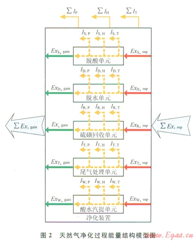 依據(jù)天然氣凈化過程能分析所確定的凈化過程3種炯損失,并借鑒“白箱”分析模型將各天然氣凈化操作單元視為一個“白箱”,每個“白箱”內(nèi)的損失為動量損失、傳熱損失和傳質(zhì)損失3部分,從而建立了如圖2所示的天然氣凈化過程能量結構模型,圖2中∑Exsup和∑Exgain為外界供人凈化過程的能及產(chǎn)品凈化天然氣物流獲得的能;∑Exs,sup和∑Exs,gain為脫酸氣單位供人和獲得的能;∑ExD,sup和∑ExD,gain為脫水單位供人和獲得的能;∑ExR,sup和∑ExR,gain為硫磺回收單位供入和獲得的能;∑ExT,sup和∑ExT,gain為尾氣處理單位供人和獲得的能;∑ExW,sup和∑Exw,gain為酸水汽提單位供入和獲得的能;∑Ip、∑IH、∑IT,分別為凈化過程產(chǎn)生的動量損失、傳熱損失和傳質(zhì)損失;IS,P、IS,H、IS,T分別為脫酸氣單位產(chǎn)生的動量損失、傳熱損失和傳質(zhì)損失;ID,P、ID,H、ID,T分別為脫水單位產(chǎn)生的動量損失、傳熱損失和傳質(zhì)損失;IR,P、IR,H、IR,T分別為硫磺回收單位產(chǎn)生的動量損失、傳熱損失和傳質(zhì)損失;IT,P、IT,H、IT,T分別為尾氣處理單位產(chǎn)生的動量損失、傳熱損失和傳質(zhì)損失;IW,P、IW,H、IW,T分別為酸水汽提單位產(chǎn)生的動量損失、傳熱損失和傳質(zhì)損失。