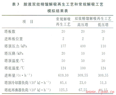 從損失分布圖可以發(fā)現(xiàn),由于雙效精餾過程將再生塔的外部損失合理利用,不僅大大降低了胺液解吸再生過程的熱量消耗,而且也降低了能損失,提高了整個胺液解吸再生過程的效率。將雙效精餾過程看成一個整體,其胺液解吸再生過程的效率為12.7%,較之于傳統(tǒng)流程單塔解吸過l2.7%,較之于傳統(tǒng)流程單塔解吸過程,效率提高了約27.0%。