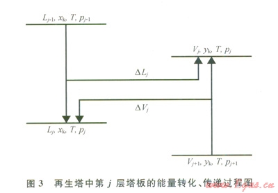 圖3表示再生塔中第j層塔板上能量的傳遞與轉(zhuǎn)換過程?,F(xiàn)以其作為研究對象,對該層塔板進行分析。