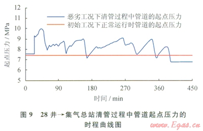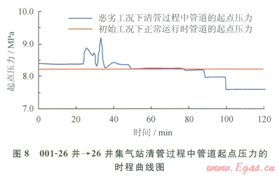 為簡(jiǎn)化起見,僅以001-26井®26井集氣站氣液混輸管道實(shí)際清管作業(yè)為例,分析清管過程中管道起點(diǎn)壓力、管道終端液體流量等工況參數(shù)的變化規(guī)律。