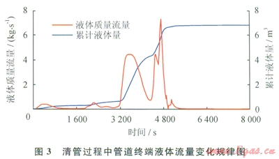 清管過程中管道終端液體瞬時(shí)質(zhì)量流量和累計(jì)液體量這2個(gè)參數(shù)是設(shè)計(jì)終端段塞流捕集器的基礎(chǔ)依據(jù),圖3給出了001-26井®26井集氣站管道清管過程中終端液體流量變化規(guī)律。由圖3可知,管道終端液體瞬時(shí)質(zhì)量流量會(huì)隨著清管時(shí)間發(fā)生劇烈波動(dòng),最大值約為7kg/s,可能會(huì)超過管道終端段塞流捕集器設(shè)計(jì)尺寸而出現(xiàn)溢流現(xiàn)象,特別是對(duì)于高含硫氣液混輸管道,其積液中存在高含量H2S等劇毒物質(zhì)可能會(huì)對(duì)周圍環(huán)境造成安全風(fēng)險(xiǎn)。此外,通過模擬管道終端累計(jì)液體體積流量,可得出管道在清管過程中排液急劇增大時(shí)段內(nèi)的總排液量,可為管道終端段塞流捕集器容量設(shè)計(jì)提供參考。