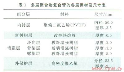 多層聚合物復合管道結構如圖1所示,其中由內至外分別為內襯層、富樹脂層、增強層和外保護層,每層具體所用的材質及尺寸如表l所示,內襯材料由比利時Sovlay公司提供。