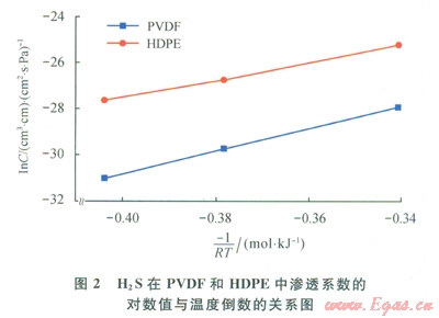 1) H2S在PVDF和HDPE中滲透系數的對數值與溫度倒數呈良好的線性關系,滲透規(guī)律符合Arrhenius模型關系: