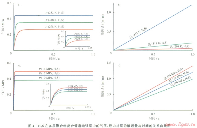 由圖4可知,當內管氣壓為12MPa時,溫度由298K升高至353K,1a內H2S在管道中產生的氣壓由0.265MPa升高到0.44MPa,大約提高了0.66倍。單位長度的氣體滲透量由0.0525m3升高到1.2m3,增大了約22倍。當溫度為353K時,管內氣壓由10MPa升高至14MPa,1a內管道中的H2S氣壓力由0.38MPa升高至0.49MPa,增大了約0.29倍。單位長度的氣體滲透量由0.98m3升高至1.40m3,增大僅0.43倍。由此可見,溫度對H2S滲透行為的影響大于內壓引起的影響。