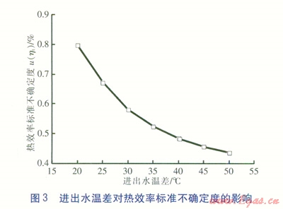 在實(shí)驗(yàn)過程中,GB 6932—2001對于熱效率測量中的水溫調(diào)節(jié)做了以下要求:調(diào)節(jié)出水溫度比進(jìn)水溫度高40℃±1℃,當(dāng)不能調(diào)節(jié)至此溫度時,在熱水溫度可調(diào)范圍內(nèi),調(diào)至最接近的溫度。其他條件不變,不同進(jìn)出水溫差對熱效率標(biāo)準(zhǔn)不確定度的影響見圖3。由圖3可知,進(jìn)出水溫差越小,將會引起熱效率標(biāo)準(zhǔn)不確定度越大。在實(shí)驗(yàn)過程中,應(yīng)該盡量達(dá)到40℃的溫差,但是進(jìn)出水溫差也不能過大,這對熱水器熱效率將會造成影響,因此在相關(guān)標(biāo)準(zhǔn)制定中,應(yīng)該綜合考慮確定具體的進(jìn)出水溫差。