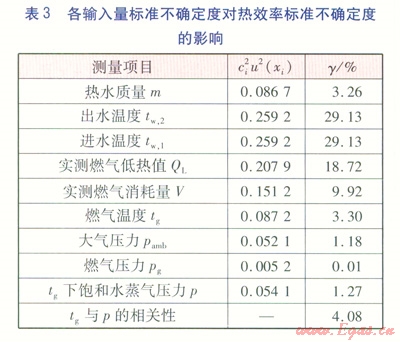 根據(jù)GB 6932—2001的要求選用測試儀器儀表,對燃?xì)鉄崴鞯臒嵝蔬M(jìn)行了不確定評定,其中A類不確定度所占的比重很小。各輸入量中,進(jìn)出水溫度、燃?xì)獾蜔嶂禈?biāo)準(zhǔn)不確定度對熱效率的標(biāo)準(zhǔn)不確定度的影響最大。