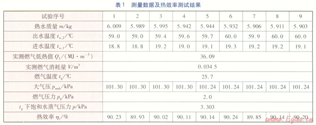 選取一臺額定熱功率為20kW的熱水器,燃?xì)夥N類為12T天然氣。執(zhí)行GB 6932—2001對測試的要求,對熱水器進(jìn)行熱效率的測定。共進(jìn)行9次測試,測量數(shù)據(jù)及熱效率測試結(jié)果見表1。