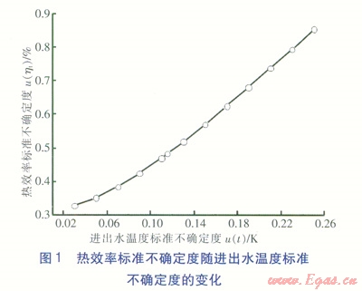 在所有輸入量標(biāo)準(zhǔn)測量不確定度中,由于進(jìn)出水溫度的標(biāo)準(zhǔn)不確定度以及燃?xì)獾蜔嶂档臉?biāo)準(zhǔn)不確定度對熱效率的標(biāo)準(zhǔn)不確定度的影響最大,因此有必要對兩者進(jìn)行深入分析。在分別改變進(jìn)出水溫度標(biāo)準(zhǔn)不確定度、燃?xì)獾蜔嶂禈?biāo)準(zhǔn)不確定度條件下,對熱效率標(biāo)準(zhǔn)不確定度的變化進(jìn)行計(jì)算(見圖1、2)。由圖1、2可知,進(jìn)出水溫度標(biāo)準(zhǔn)不確定度、燃?xì)獾蜔嶂禈?biāo)準(zhǔn)不確定度的改變對熱效率標(biāo)準(zhǔn)不確定度的影響很大。