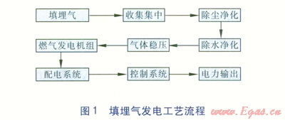 填埋場(chǎng)填埋氣發(fā)電原理是將固體廢棄物填埋場(chǎng)產(chǎn)生的填埋氣通過收集系統(tǒng)集中,再通過預(yù)處理裝置凈化(除塵、除水等)、穩(wěn)壓后送入燃?xì)獍l(fā)電機(jī)組,發(fā)電后通過配電系統(tǒng)、控制系統(tǒng),將發(fā)出的電能輸送到電網(wǎng)(填埋氣發(fā)電工藝流程見圖1)。