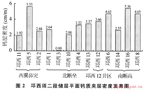 根據(jù)上述鈣質(zhì)砂巖測(cè)井曲線特征,對(duì)區(qū)內(nèi)13口井進(jìn)行了鈣質(zhì)夾層解釋和分布特征研究。研究結(jié)果表明:平面上,除邛西3井外,各井均發(fā)育一定數(shù)量的鈣質(zhì)砂巖層,其中以邛西5井、邛西16井鈣質(zhì)砂巖層發(fā)育密度最大,其次為邛西6和邛西8井(圖2)。