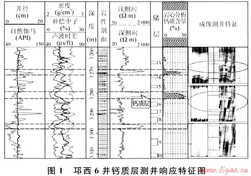 1) 鈣質(zhì)夾層主要巖性為長(zhǎng)石砂巖、巖屑砂巖和長(zhǎng)石巖屑砂巖,測(cè)井響應(yīng)特征為:低自然伽馬、低聲波時(shí)差和刺刀狀的高電阻率值特征,成像測(cè)井的影像特征為呈亮帶狀分布。