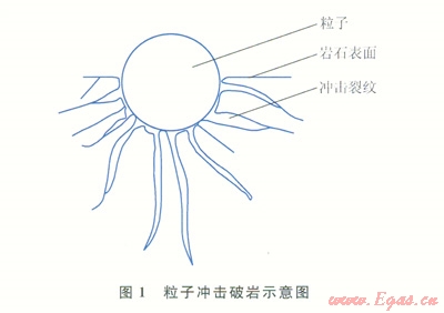 1)高速的粒子沖擊到巖石的表面后,接觸應(yīng)力繼續(xù)增加時,會在接觸面附近的巖石內(nèi)部產(chǎn)生剪切應(yīng)力和拉伸應(yīng)力,當(dāng)粒子沖擊產(chǎn)生的拉應(yīng)力和剪應(yīng)力大于巖石的抗拉和抗剪強度后,破碎的裂紋開始產(chǎn)生。粒子以100m/s以上的速度沖擊巖石,粒子含量為2%時,粒子沖擊的頻率每分鐘達(dá)500萬次。