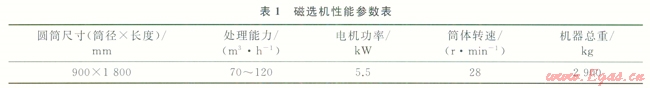 代入數(shù)據(jù)得滾筒半徑為0.145m,則滾筒的直徑為290mm,磁鼓的線速度為228.6m/min。設(shè)汁的磁選機滾筒直徑為900mm,滾筒最大轉(zhuǎn)速為40r/min。磁選機的性能參數(shù)如表1所示。
