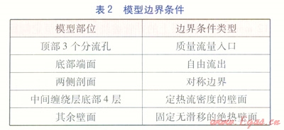 對于殼側(cè)36°物理模型,流體從頂部3個分流孔流入,從底部端面流出,兩側(cè)剖面為對稱邊界,中間纏繞層底部4列為加熱壁面,其余壁面均為固定無滑移絕熱壁面,模型邊界條件見表2,輸入的參數(shù)見表3。表3中的參數(shù)值與AUNAN的實驗數(shù)據(jù)8[180-187]相一致。