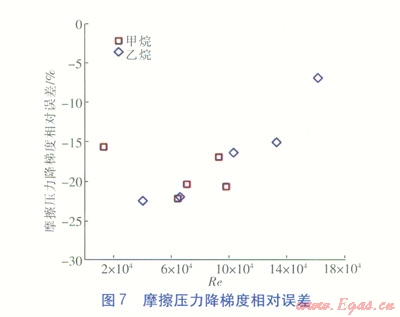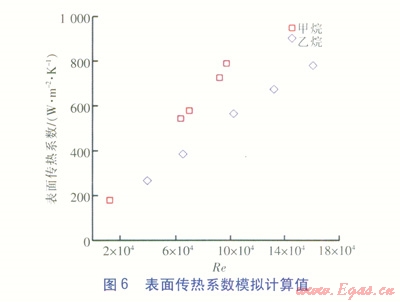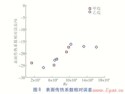 從圖5和圖6可看出,殼側(cè)制冷劑過熱態(tài)流動時摩擦壓力降梯度、表面?zhèn)鳠嵯禂?shù)均與雷諾數(shù)呈同向變化,摩擦壓力降梯度變化范圍較大,表面?zhèn)鳠嵯禂?shù)基本在200~1000W/(m2·K)。從圖7和圖8可看出,無論是甲烷還是乙烷,摩擦壓力降梯度相對誤差和表面?zhèn)鳠嵯禂?shù)相對誤差基本都控制在-25%~-15%范圍內(nèi),并且表面?zhèn)鳠嵯禂?shù)相對誤差隨著雷諾數(shù)增大而變小。由于殼側(cè)模型幾何形狀復雜,流道間隙細小,所以在不修正湍流模型的情況下數(shù)值計算相對誤差尚可。