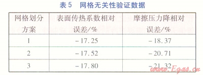 為了考察網(wǎng)格疏密程度對數(shù)值求解的影響以及確定網(wǎng)格劃分方案,本文以AUNAN的一組甲烷過熱氣實驗數(shù)據(jù)[8]165作為依據(jù),采用動態(tài)模擬進行計算,壁面函數(shù)為增強壁面函數(shù),網(wǎng)格無關(guān)性驗證數(shù)據(jù)見表5。