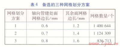 使用ANSYS ICEM CFD軟件對物理模型進行網(wǎng)格劃分,采用非結(jié)構(gòu)化網(wǎng)格,先對面生成網(wǎng)格,進而自適應生成體網(wǎng)格。在整個模型中,纏繞管的軸向管縫寬1.94mm,為最小的幾何尺度,故以此作為面網(wǎng)格的劃分依據(jù),備選的三種網(wǎng)格劃分方案見表4。另外,為了精確計算摩擦壓力降和表面?zhèn)鳠嵯禂?shù),特在三層纏繞管的壁面處設(shè)置較細的邊界層,邊界層起步厚度為0.005mm,增長因子為1.2,共計10層邊界層。