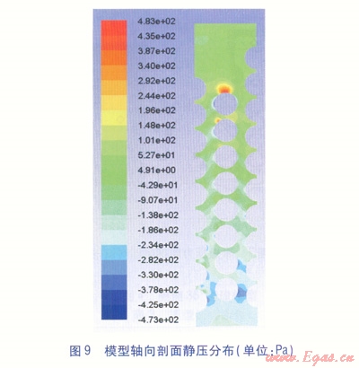 以甲烷在Re=7×104下(對應的質(zhì)量流量為0.0185kg/s)的流動、換熱為例,圖9~11分別是模型軸向通過中間分流孔中心的剖面(以下簡稱軸向剖面)靜壓、速度、溫度分布圖,圖12是加熱管周圍速度分布局部放大圖,圖13是加熱管壁面溫度分布圖,圖14是沿模型高度方向跨度取0.5倍軸向間距(6.97mm)時的流道靜壓變化圖。