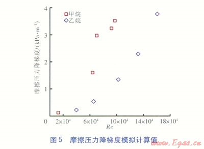 根據(jù)已建立的物理模型,使用ANSYS FLUENT軟件分別對AUNAN的甲烷、乙烷過熱氣流動實驗數(shù)據(jù)(見表3)進行了數(shù)值模擬,模擬具體設(shè)置見表6。在來流進入殼側(cè)流道之后,以圖4中的流道截面1和2作為計算數(shù)據(jù)獲取位置,摩擦壓力降梯度與表面?zhèn)鳠嵯禂?shù)(本文中的表面?zhèn)鳠嵯禂?shù)均指4個加熱壁面處的平均表面?zhèn)鳠嵯禂?shù))模擬計算值見圖5和圖6,模擬計算值與實驗值之間的相對誤差見圖7和圖8。在圖5~8中,雷諾數(shù)(Re)和摩擦壓力降梯度(Dp)的定義分別如下: