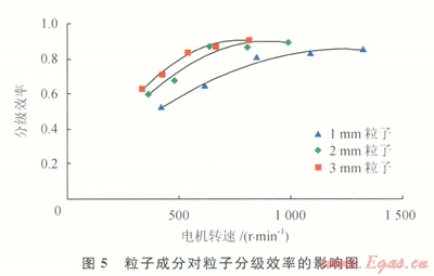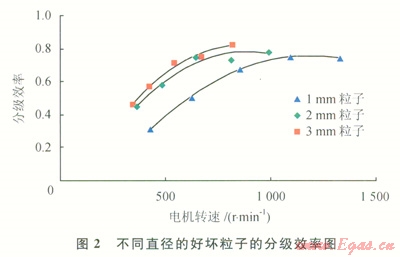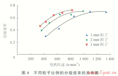 實驗材料仍為直徑分別為1mm、2mm、3mm的好壞粒子的混合物,但好壞粒子混合比例變?yōu)?span lang="EN-US">1:1(體積比),得到分級效率和電機轉(zhuǎn)速之間的關(guān)系(圖4)。