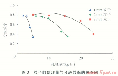 從圖3中可以看出,對于某一直徑的鋼粒子混合物,隨著粒子處理量的增加,分級效率呈現(xiàn)下降趨勢;鋼粒子的直徑越小,其分級效率受處理量的影響越大。分析得出,出現(xiàn)該種情況的原因是大直徑完整粒子與破損粒子的質(zhì)量差異較大,小直徑完整粒子與破損粒子的質(zhì)量差異較小,該分離機分離好壞粒子的機理在于質(zhì)量的差異,因此也就出現(xiàn)了分選裝置處理粒子的能力和鋼粒子直徑相關(guān)的現(xiàn)象。