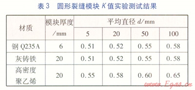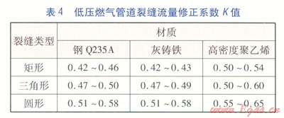 經(jīng)多次實驗驗證,在燃氣低壓供氣狀況下,改變?nèi)細獾膲毫?span lang="EN-US">(緩沖罐內(nèi)燃氣壓力),測試的K值不變,且K值受模塊壁厚影響甚微。由此得出管道裂縫流量修正系數(shù)K的取值范圍,見表4。
