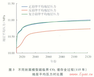 圖3給出了在剖面模型兩端底部注氣,中間頂部采氣的相同注采對(duì)應(yīng)關(guān)系下,3種氣藏剖面模型超臨界CO2驅(qū)氣及埋存整個(gè)過(guò)程(約115年)中地層平均壓力隨時(shí)間的變化對(duì)比曲線。預(yù)測(cè)結(jié)果顯示,在相同關(guān)井條件下(生產(chǎn)井采出天然氣中CO2摩爾百分含量達(dá)到l0%時(shí)關(guān)閉生產(chǎn)井),正韻律地層可連續(xù)保持8年的超臨界CO2注入和天然氣的開(kāi)采,反韻律地層可連續(xù)保持l0年的超臨界CO2注入和天然氣的開(kāi)采,而復(fù)合韻律地層介于兩者之間,保持在9年左右。由此可知,在剖面模型兩端底部注氣,中間頂部采氣的相同注采對(duì)應(yīng)關(guān)系下,反韻律地層超臨界CO2在采氣井突破后達(dá)到l0%的CO2含量的時(shí)間最晚,天然氣采出程度最高,埋存潛力最大;而且反韻律地層在超臨界CO2停止注入后持續(xù)封存過(guò)程中,地層壓力的上升幅度最小。根據(jù)超臨界CO2—天然氣體系相態(tài)特征研究結(jié)果[8-11],相同地層條件下,等質(zhì)量數(shù)的超臨界CO2—天然氣混合物其體積要比高密度的超臨界CO2的大??芍错嵚傻貙又?,剩余天然氣擴(kuò)散彌散引起的超臨界CO2體積膨脹的程度相對(duì)最低,最有利于超臨界CO2的穩(wěn)定埋存。