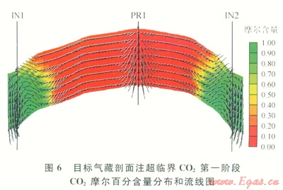 圖6給出了目標(biāo)氣藏剖面模型超臨界CO2埋存及驅(qū)替天然氣初期,CO2摩爾百分含量及地層流體滲流的流線分布。圖中流線方向顯示,反韻律地層中,超臨界CO2從2口注氣井下部注入后,受滲透率反韻律影響,先是沿近井區(qū)地層向上部流動(dòng),然后在密度流和重力分異作用下,沿水平和下傾方向向氣藏中部和下部運(yùn)移,而天然氣被驅(qū)向氣藏中部和上部。超臨界CO2前緣推進(jìn)較為均勻,氣體對(duì)流擴(kuò)散運(yùn)移對(duì)超臨界CO2 天然氣過(guò)渡帶的擾動(dòng)較小,而儲(chǔ)層非均質(zhì)影響較大,上部高滲層中超臨界CO2彌散和滲流快,重力舌進(jìn)現(xiàn)象較強(qiáng),過(guò)渡帶寬度大于下部低滲層。