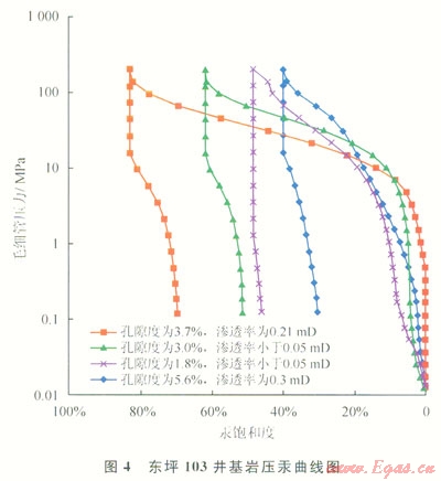 基巖儲層屬于雙重介質,29個巖樣的物性分析結果表明:基質孔隙度介于1.2%~7.2%,平均為3.4%;滲透率介于0.054~0.91mD,平均為0.19mD,儲層致密。壓汞實驗結果表明:基質排驅壓力在7MPa以上,部分樣品推測受裂縫影響,沒有平直段,排驅壓力較低(圖4);進汞飽和度介于30%~80%。目前僅有4塊壓汞實驗樣品,實驗結果差異較大,也反映了基巖微觀非均質性較強,其礦物溶孔和裂縫的分布差異較大。