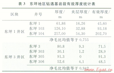 對于基巖塊狀氣藏,根據(jù)現(xiàn)有井測井響應特征和取心資料,可以初步劃分出基巖井段內的致密夾層,算出基巖段內儲集層的有效厚度(表3)。