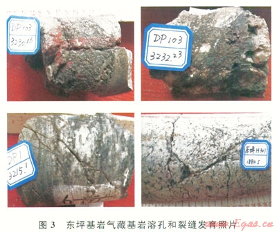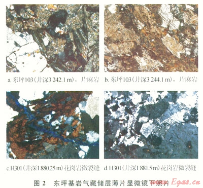 1)東坪1井區(qū):主要以花崗片麻巖為主。從巖心上可觀察到高角度裂縫發(fā)育,裂縫寬度為1~2mm,裂縫發(fā)育程度好。東坪103井井深3200m靠近基巖風化殼,可觀察到風化溶蝕孔洞(圖3),但總體上發(fā)育較少。巖心裂縫十分發(fā)育,多數(shù)巖心呈碎塊狀態(tài)。