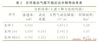 通過對3口井不穩(wěn)定試井解釋結果的統(tǒng)計表明(表2),各井控制儲量、控制面積、滲透性等在不同井段和井區(qū)差異較大,同樣說明基巖內部的非均質性較強。