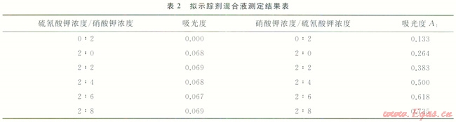 配制兩組擬示蹤劑混合樣品,第一組按照硫氰酸根的檢測(cè)方法,在455nm處測(cè)量硫氰酸根的吸光度;第二組按照硝酸根的檢測(cè)方法,在210nm處測(cè)量硝酸根的吸光度,測(cè)量結(jié)果如表2所示。