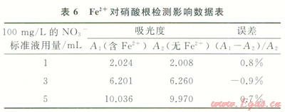 在50mL容量瓶中配制不同濃度NO3-標(biāo)準(zhǔn)溶液,一組加入1mL的100mg/L Fe2+標(biāo)準(zhǔn)液作對(duì)照,測(cè)得的NO3-吸光度如表6所示。