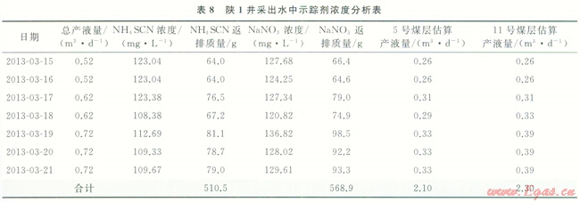 2012年12月對(duì)陜1井進(jìn)行了分層壓裂施工,11號(hào)煤壓裂注入壓裂液1153m3,加入NaNO3 500kg,示蹤劑NaNO3在單層壓裂液中的平均濃度約為430mg/L;5號(hào)煤壓裂,注入壓裂液1135m3,加入NH4SCN 500kg,示蹤劑NH4SCN在單層壓裂液中的平均濃度約為440mg/L。壓裂施工完成后,于2013年3月10日開始進(jìn)行排采,2013年3月15日開始連續(xù)一周每天取樣進(jìn)行室內(nèi)檢測(cè),按照前面實(shí)驗(yàn)室分析方法分析SCN-和NO3-測(cè)得采出水中兩種示蹤劑的含量如表8所示。