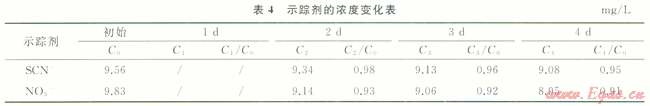 根據(jù)表4結(jié)果表明,煤粉對(duì)SCN-和NO3-雖具有一定的吸附作用,但每天Ci/C0的值遞減較慢,4d后Ci/C0均大于0.8,滿足示蹤劑靜態(tài)吸附實(shí)驗(yàn)要求。
