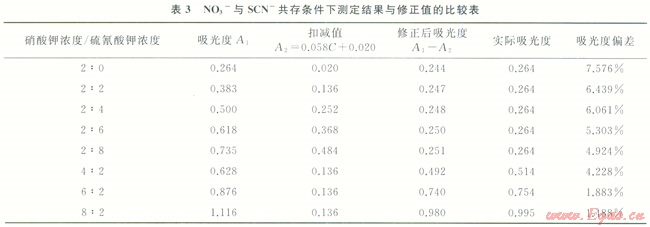 由表3可知,NO3-吸光度經(jīng)修正后,總體偏低,但誤差可控制在7.576%范圍內(nèi)。該修正方法降低了SCN-對(duì)NO3-測(cè)量的影響。