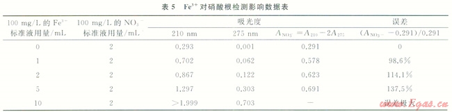 由表5結(jié)果表明:不加Fe3+時(shí),NO3-標(biāo)準(zhǔn)液因不含有機(jī)物,在275nm處幾乎無吸收,加入Fe3+標(biāo)準(zhǔn)液后,溶液在210nm、275nm處吸光度明顯提高,這說明Fe3+在210nm、275nm處均有強(qiáng)烈吸收,對(duì)NO3-的測(cè)定結(jié)果影響較大,能使測(cè)定結(jié)果大大增加。