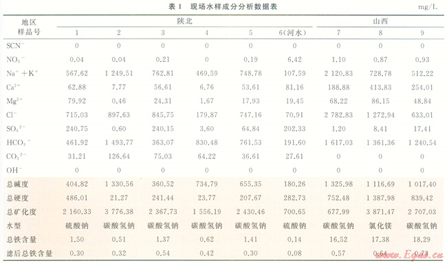將現(xiàn)場(chǎng)所取回的2個(gè)區(qū)塊的8個(gè)水樣和1個(gè)壓裂液配水樣品進(jìn)行常規(guī)水質(zhì)分析[5],同時(shí)進(jìn)行了SCN-[6]和NO3-[7]的檢測(cè)。實(shí)驗(yàn)結(jié)果如表l所示。