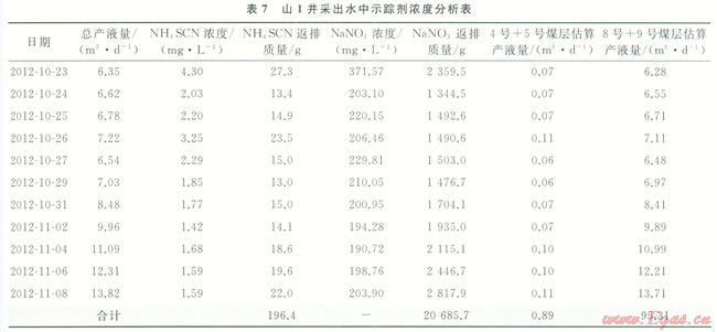 2012年5月對(duì)山1井2個(gè)層進(jìn)行了壓裂施工,8號(hào)+9號(hào)煤層注入壓裂液975.6m3,加入NaNO3 500kg,示蹤劑在單層壓裂液中的平均濃度約為510mg/L;4號(hào)+5號(hào)煤層注入壓裂液1003.5m3,NH4SCN用量500kg,示蹤劑在單層壓裂液中的平均濃度約為500mg/L。施工完成后,關(guān)井?dāng)U散壓力。油嘴控制排液,無液體返出。同年10月17日進(jìn)行排采,10月23日開始對(duì)采出液進(jìn)行采樣分析,17d內(nèi)取了11個(gè)樣,按照前面實(shí)驗(yàn)室分析方法分析SCN和NO3-(除鐵,扣減SCN吸光度的方法進(jìn)行修正),采出水中各種示蹤劑的含量如表7數(shù)據(jù)所示。