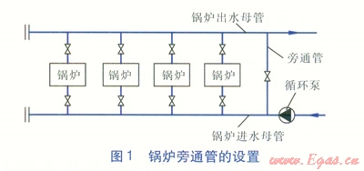 在熱水鍋爐房系統(tǒng)中,在鍋爐的進(jìn)出水母管之間一般設(shè)置一條旁通管道(見圖l)。鍋爐旁通管有以下兩種作用,分別計算確定鍋爐旁通管管徑后,選取較大的管徑。