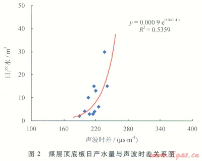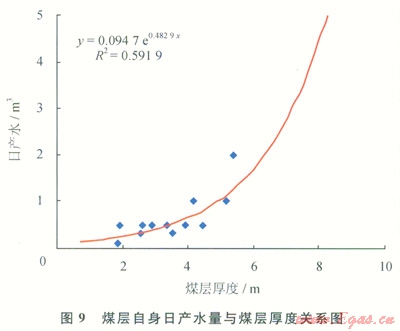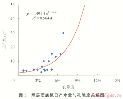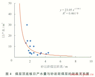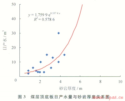 煤層直接頂?shù)装鍨樯皫r時,物性較好,且砂巖厚度越大,則頂?shù)装迳皫r的含水性越強,煤層壓裂后頂?shù)装迳皫r的地層水易于產(chǎn)出,排采出水量亦較大。如果砂巖為老頂?shù)?,但直接頂?shù)装宓哪鄮r較薄,壓裂時容易壓穿直接頂?shù)装宓哪鄮r,致使壓裂縫溝通了老頂?shù)椎纳皫r而增大出水量,且隨著砂巖距煤層越近,越易于壓穿直接頂而溝通砂巖含水層,為此,頂?shù)装迳皫r的厚度、孔隙度及距煤層的距離與煤層排采出水量有較大的關系。