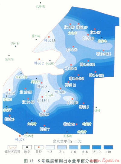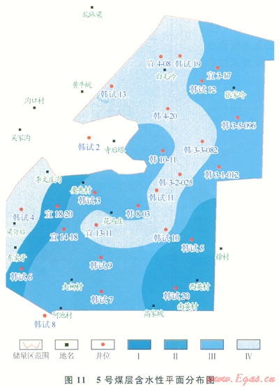 基于煤層自身產(chǎn)水量測井預測結果及上述劃分標準,編繪了5號煤層含水性平面分布圖(圖11)。由圖11可知,5號煤東南部韓試5、韓試20井區(qū),及西南部宜18-20、韓試6井區(qū)含水性較強,其他區(qū)域則相對較弱。