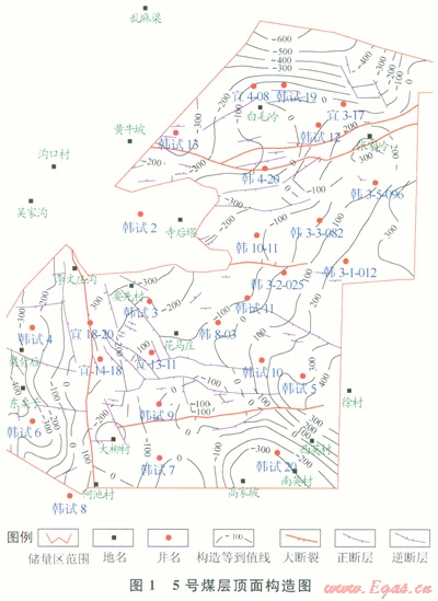 2)研究區(qū)5號煤層的排采出水量分析表明,近斷裂帶和構造低幅度區(qū)排采出水量較大,遠離斷裂帶和構造低幅度區(qū),但頂?shù)装迳皫r含水層也會致使排采出水量增大??傮w上呈現(xiàn)南部和北部及中部韓3-2-025井區(qū)出水量較大,沿斷裂帶、構造低幅度區(qū)及頂?shù)装迳皫r區(qū)出水量較大,是排采的不利區(qū)域。