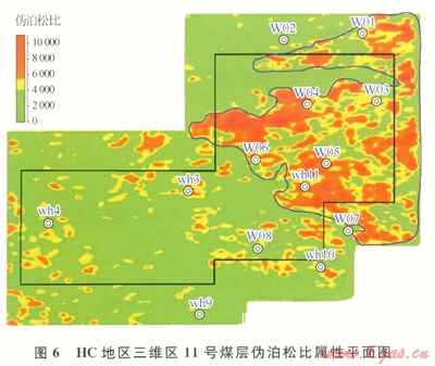 基于上述偽泊松比與煤的裂縫發(fā)育程度正相關的理論和實驗研究,提取該區(qū)偽泊松比屬性(圖6),圖中紅色代表偽泊松比值大,推測藍色多邊形圈定的區(qū)域裂縫發(fā)育。同時把ll號煤層偽泊松比屬性和滲流曲線進行對比發(fā)現(xiàn),滲流值較大的區(qū)域對應于偽泊松比值大的范圍,因而可以推測這個區(qū)域為11號煤層滲透性較好的區(qū)域。