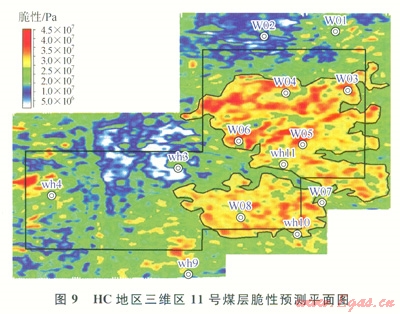 在沿11號煤層提取的脆性預測平面圖(圖9)上可以看到:黑色多邊形圈中的紅色區(qū)域指示煤層脆性比較高,主要位于工區(qū)中東部,壓裂時易產(chǎn)生裂縫;而西部地區(qū)巖石的脆性較低,不易于壓裂。
