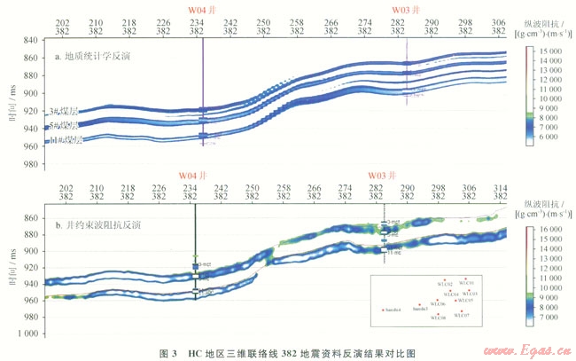 測井曲線分析表明,煤層縱波阻抗明顯低于砂泥巖,因而可以應用聲波阻抗反演方法預測煤層厚度。但由于該區(qū)煤層厚度薄、不同井間厚度變化大,為提高薄煤層分辨能力,在縱波阻抗反演基礎上應用地質(zhì)統(tǒng)計學反演得到了比較好的效果,從圖3中可以看出地質(zhì)統(tǒng)計學反演結果對薄煤層(藍色為雕刻出的煤層)反映特別清晰,與井吻合性更好,由此獲得的煤層厚度預測平面圖精度更高。
