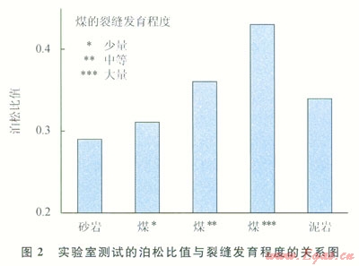 Gregory發(fā)現(xiàn)巖石的裂縫引起縱橫波速度比和泊松比的增大[7]。Ramos and Davis實驗測試表明新墨西哥州Cedar Hill Field的煤層樣品泊松比和裂縫密度有關[8-9](圖2),可以看出煤層的泊松比隨著裂縫密度由低到高增加了30%。當然實驗室測量結果不等同于現(xiàn)場煤層的割理情況,但是圖2所揭示的泊松比和煤層裂縫密度之間的關系是可靠的,可用于現(xiàn)場煤層泊松比和裂縫密度的預測,即煤層的泊松比和裂縫密度為正相關。在AVO理論中,假定vp/vs=2,偽泊松比反射率(Ds/s)等于截距與梯度之和的一半[9],反映的是反射界面兩側介質(zhì)的泊松比差值,與泊松比是呈正相關的。因此,AVO反演得到的偽泊松比反射系數(shù)屬性可以用于指示裂縫發(fā)育特征,偽泊松比值大,則裂縫發(fā)育程度高。