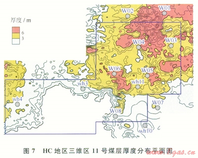 在地質(zhì)統(tǒng)計學反演基礎上編制完成11號煤層厚度平面圖(圖7),從圖上可以看出11號煤層在工區(qū)西南部尖滅,東部和北部發(fā)育較厚,圖中黃色和紅色區(qū)域煤層厚度大于3m,是煤層氣開采的有利區(qū)域。